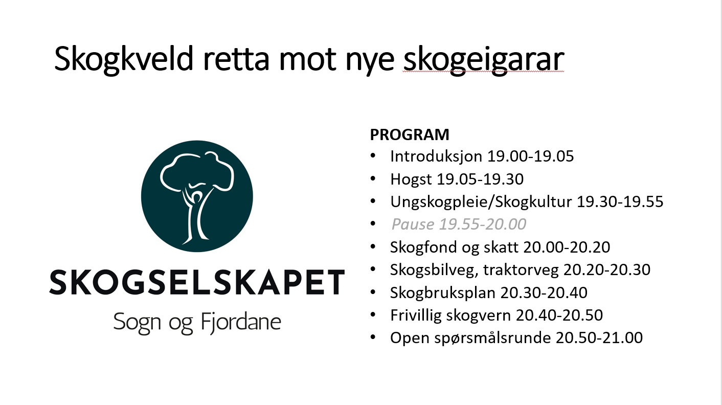 Her går me gjennom tema som hogst, tømmerprisar både no og framover, tiltak etter før/etter hogst, skogfond og skatt, skogsbilveg, skogbruksplan og frivillig skogvern.
