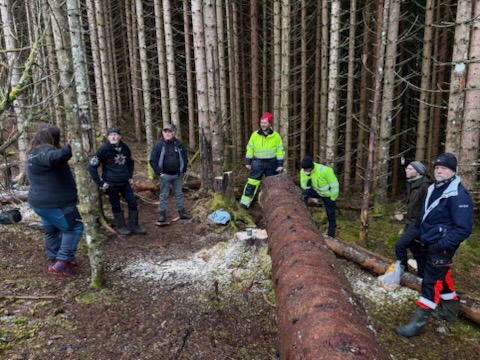 Instruktør Arnt Laukeland går gjennom kvalitetskrav for levering av tømmer i form av eigenhogst. Det blir demonstrert med tømmer som nyleg er avvirka, som vil vere gode døme på ulike sortiment.